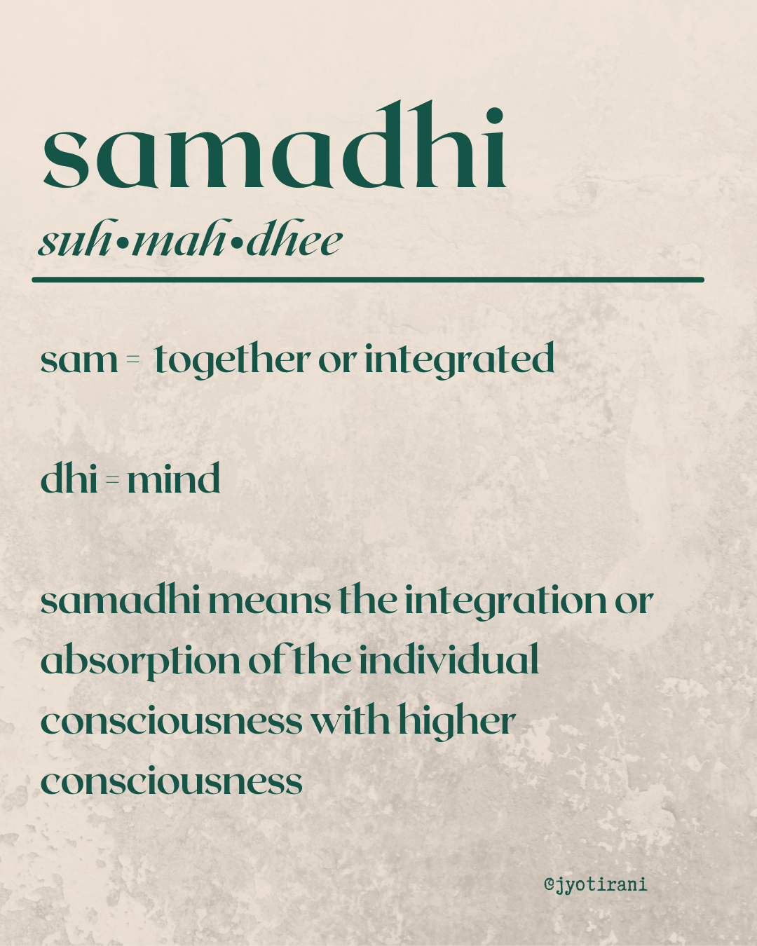 Samadhi (suh-mah-dhee), the eighth and final limb of Patanjali's Yoga Sutras, is the ultimate goal of yoga. This Sanskrit word is derived from the word ‘sam’ which means together or integrated and ‘dhi’ which means mind. Together it means the integration or absorption of the individual consciousness with higher consciousness ~ a state of oneness. It’s the realisation of a profound spiritual practice.